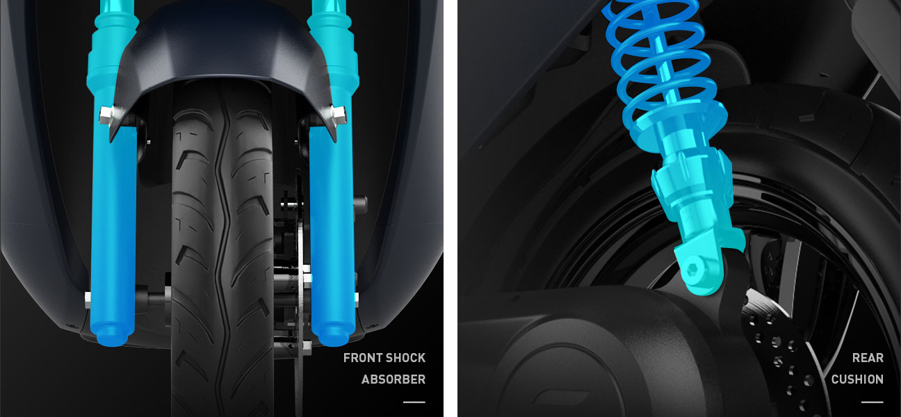De Ecooter E2 is voorzien van dubbele vering aan de voor- en
